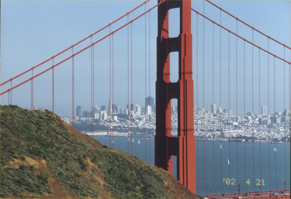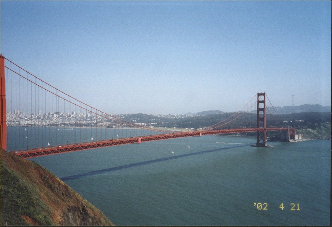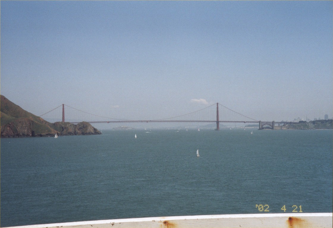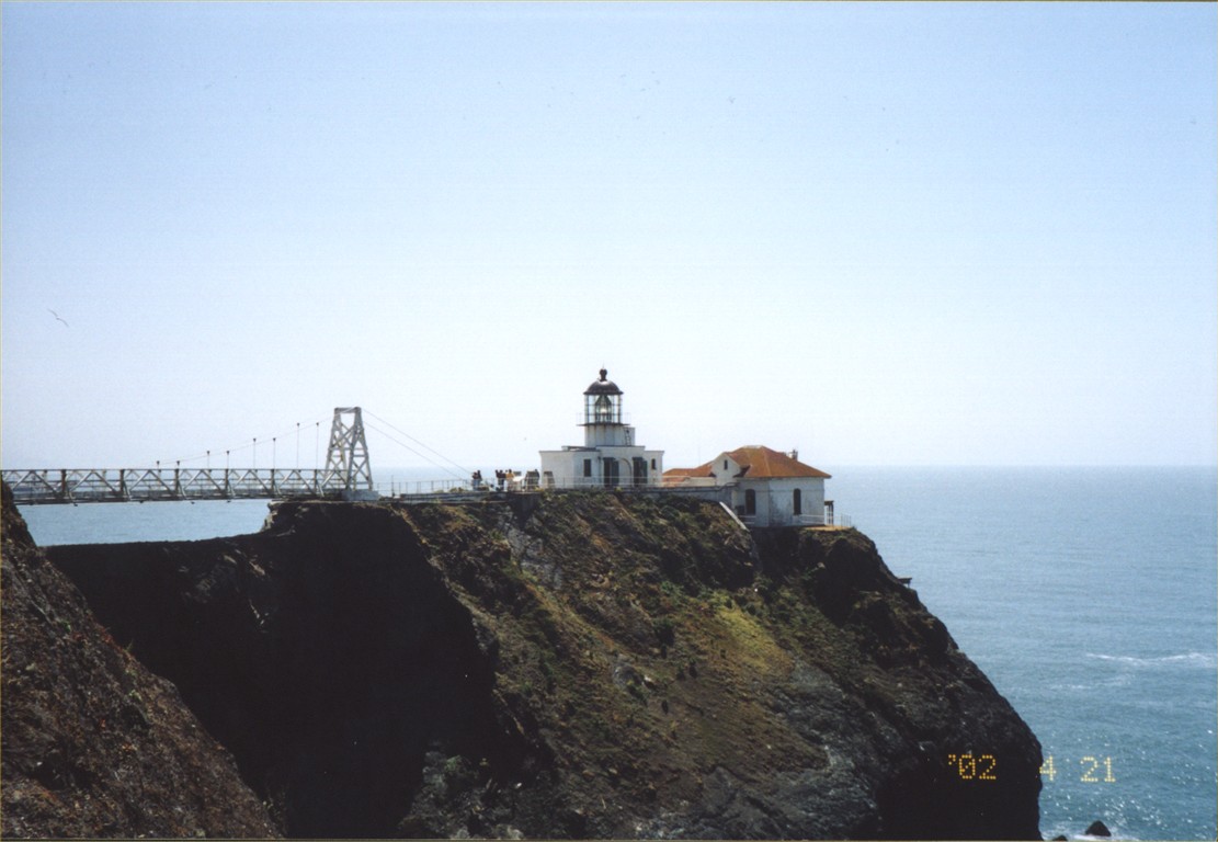 Мыс Бонита и Сан Франциско, 21 апреля 2002. 1. Дорога к маяку, сам маяк и домик немного видны справа от горки. 2. Маяк и дом смотрителя маяка. 3. Вид на пролив и мост от маяка. 4-5. Вид на мост и город Сан Франциско.