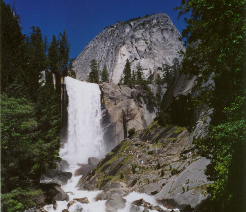 4. Водопад Vernal, 97 м, не самый высокий, но самый многоводный в долине. Если приглядеться, то видны люди, которые лезут по камням, чтобы поближе посмотреть на водопад