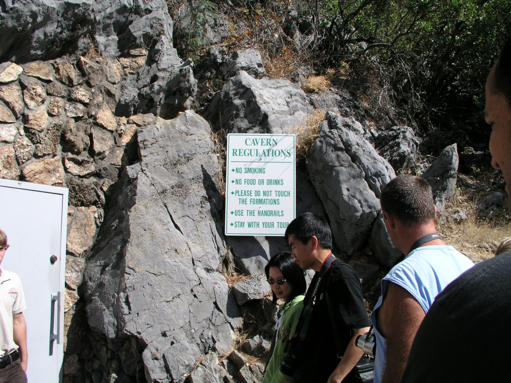 Доступ к пещере сам по себе интересен – сначала ты оставляешь машину на стоянке и тебя везут на простеньком пароме через рукав озера. Затем на небольшом автобусе тебя подвозят на почти триста метров вверх в гору, а там обычная железная дверь и рядом табличка “не курить, руками не трогать”.