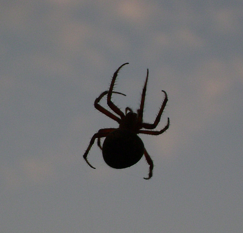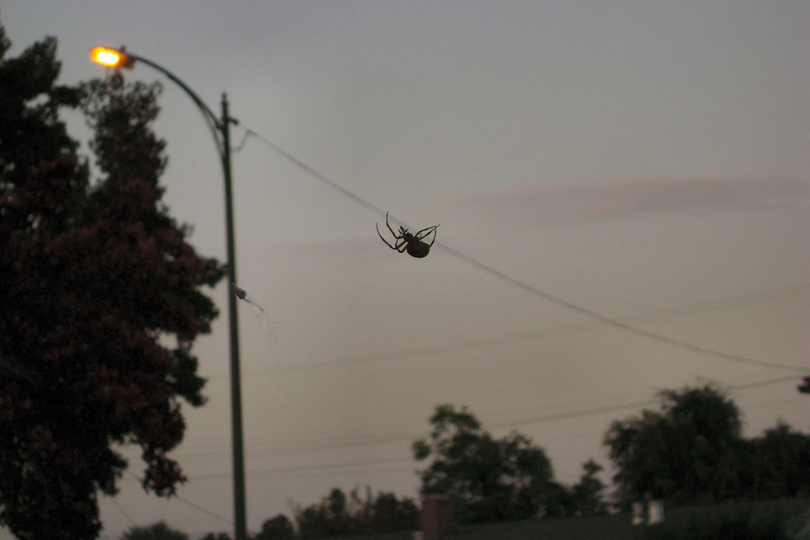 Совершенно не помню – специально ли я делал такой кадр, что громадный паук как бы ползёт по проводам с одного столба на другой, или случайно получилось. На втором кадре этот же паук висит на невидимой на фоне вечернего неба паутине.