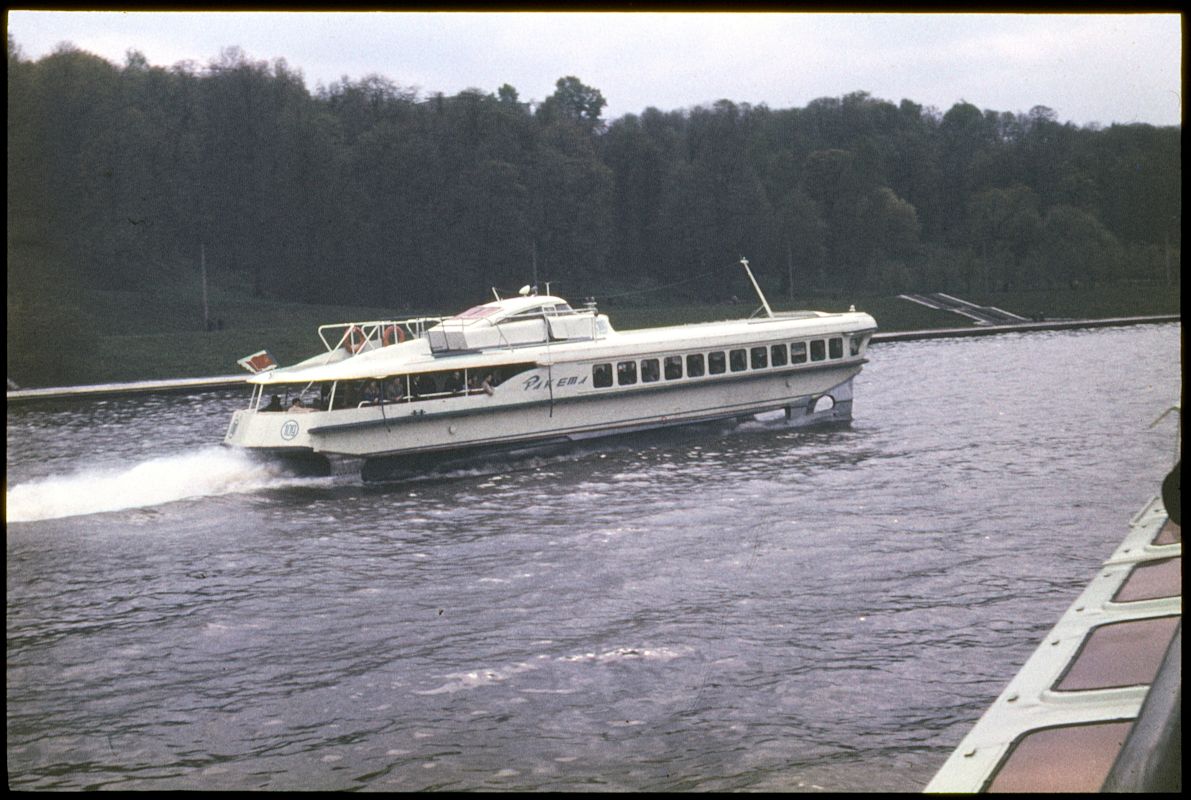 В начале 1982 я освоил проявку слайдовой плёнки, но первые “несемейные” слайды относятся к 1983 году. Москва, апрель 1983. Мы с друзьями прокатились на теплоходе, и я сделал фото обгонявшей нас “Ракеты”.